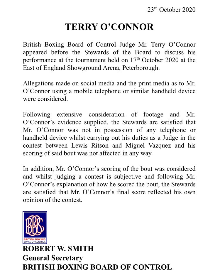 “Following extensive consideration of footage and Mr. O’Connor’s evidence supplied, the Stewards are satisfied that Mr. O’Connor was not in position of any telephone or handheld device whilst carrying out his duties as a Judge in the contest between Lewis Ritson and Miguel Vazquez and his scoring of said bout was not affected in any way.